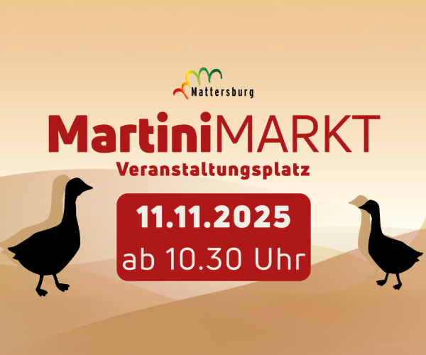 Am Dienstag, dem 11. November 2025, lädt die Stadtgemeinde Mattersburg ab 10.30 Uhr zum MartiniMarkt am Veranstaltungsplatz ein. Der Markt bietet ein vielfältiges Programm mit Kunsthandwerk, Weinverkostung, Kulinarik und Live-Musik.