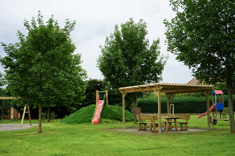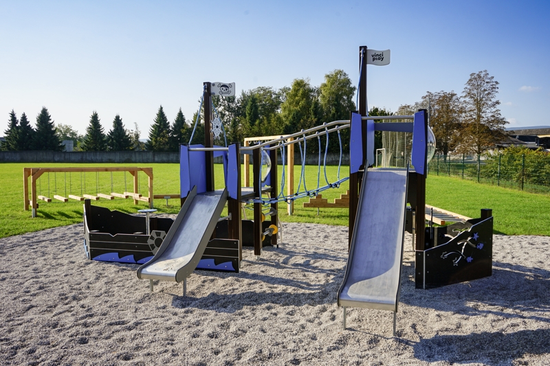 Ein Teil der großen Wiesenfläche bleibt bewusst frei von Spielgeräten, um weiterhin Platz für freies Spielen, Ballspiele oder Veranstaltungen zu bieten. Damit ist der Spielplatz vielseitig nutzbar und spricht Kinder jeden Alters an.