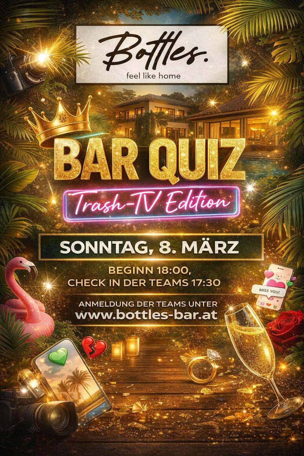 Drama. Glamour. Reality-TV. Das Bar Quiz – Trash-TV Edition kommt ins Bottles! Von Dschungelcamp bis Sommerhaus, von großen Gefühlen bis zu ganz viel Fremdscham – hier ist alles dabei, was wir heimlich lieben Sonntag, 8. März Beginn 18:00 Uhr | Check-in ab 17:30 Uhr Bottles – feel like home Jetzt Team anmelden: www.bottles-bar.at Plätze sind limitiert – Drama garantiert!