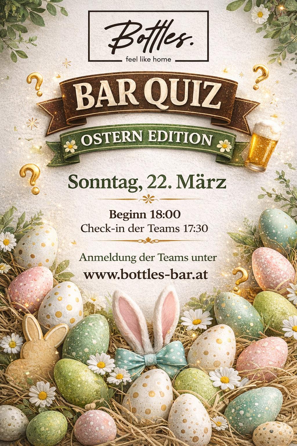 Ostern mal anders Beim Bar Quiz – Ostern Edition erwarten euch spannende Fragen, gute Drinks und beste Stimmung. Sonntag, 22. März Beginn 18:00 Uhr | Check-in der Teams ab 17:30 Uhr Bottles – feel like home Jetzt Team anmelden: www.bottles-bar.at