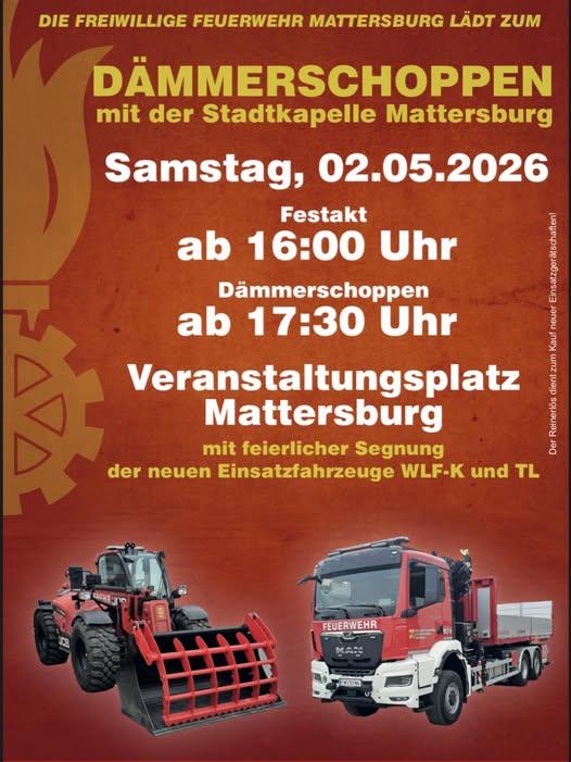 Am Samstag, den 02. Mai 2026, lädt die Freiwillige Feuerwehr Mattersburg herzlich zur Fahrzeugsegnung mit anschließendem Dämmerschoppen mit der Stadtkapelle Mattersburg ein. Der Festakt beginnt um 16:00 Uhr am Veranstaltungsplatz in Mattersburg. Im Rahmen der Feier findet die feierliche Segnung des neuen Wechselladerfahrzeug-Kran und des Teleskoplader statt. Ab 17:30 Uhr startet dann der gemütliche Dämmerschoppen mit musikalischer Umrahmung durch die Stadtkapelle. Die Feuerwehr Mattersburg freut sich auf zahlreiche Besucher und einen stimmungsvollen Abend!