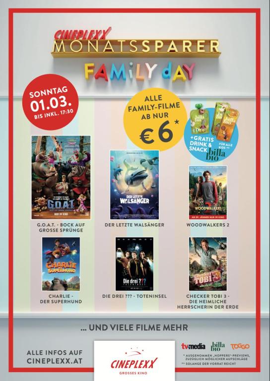 Feiert mit uns den CINEPLEXX MONATSSPARER FAMILY DAY*! Am 1. März erhält jedes Kind zusätzlich zur CINEPLEXX MONATSSPARER FAMILY DAY Preisaktion ab € 6* auf alle FAMILY FILME einen Bio-Fruchtsaft und einen Bio-Snack** GRATIS zu jedem Kinoticket.