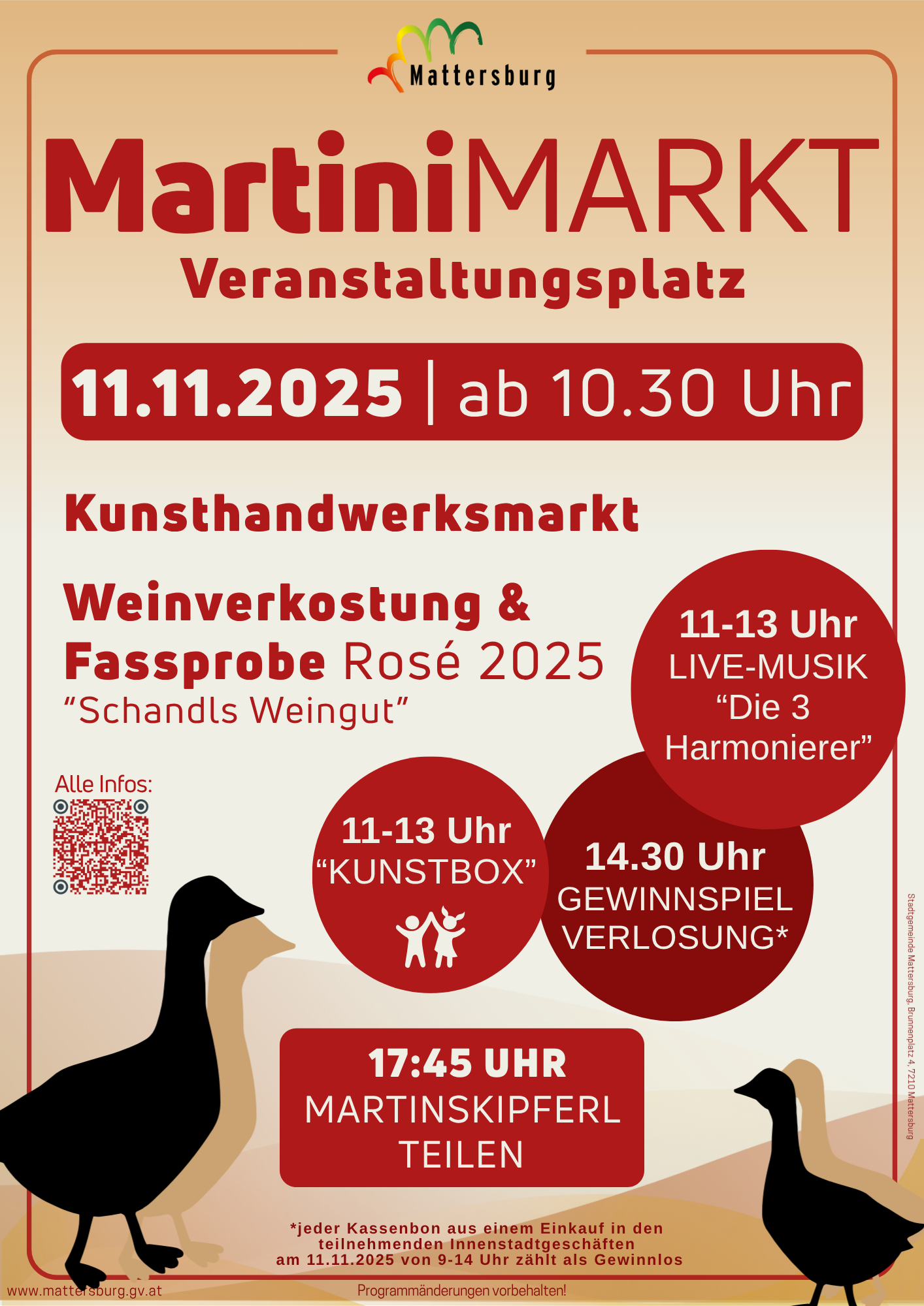 Am 11. November 2025 verwandelt sich der Veranstaltungsplatz in Mattersburg wieder in einen bunten Martinimarkt mit Kunsthandwerk, Kulinarik, Weinverkostung und Live-Musik!