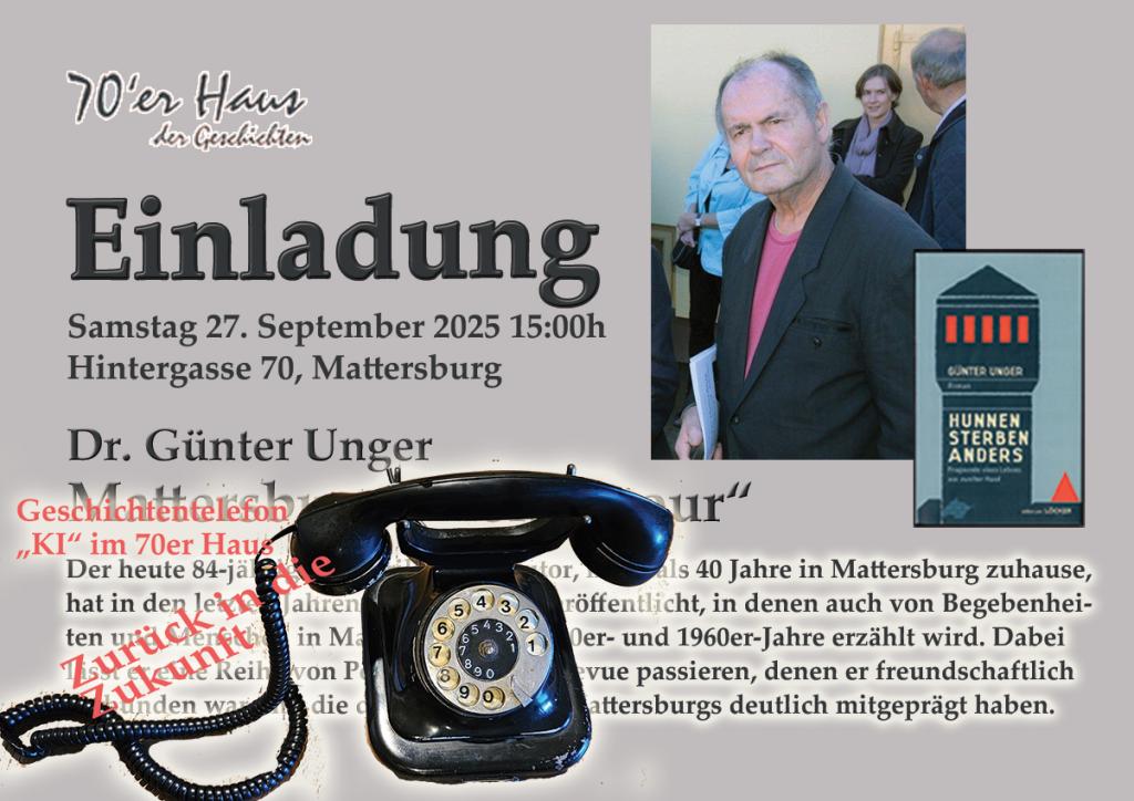 Der heute 84-jährige Historiker und Autor, mehr als 40 Jahre in Mattersburg zuhause, hat in den letzten Jahren zwei Romane veröffentlicht, in denen auch von Begebenheiten und Menschen in Mattersburg der 1950er- und 1960er-Jahre erzählt wird. Dabei lässt er eine Reihe von Persönlichkeiten Revue passieren, denen er freundschaftlich verbunden war und die die Entwicklung Mattersburgs deutlich mitgeprägt haben.
