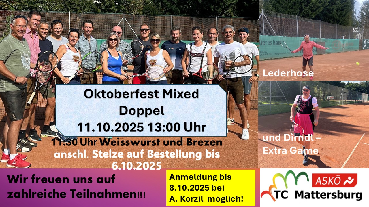 Am 11.10.2025 findet das beliebte Oktoberfest Mixed Doppel des ASKÖ TC Mattersburg statt. Eingeladen sind nicht nur Vereinsmitglieder sondern alle die gerne ein gemütliches Doppel mit Oktoberfestflair spielen wollen. In Lederhose oder Dirndl gibt es ein Game Vorsprung. Um 11:30 Uhr wird mit Weißwürsten und Weißbier das Turnier gestartet. Anschließend gibt es auf Bestellung Stelze und Oktoberfestbier.