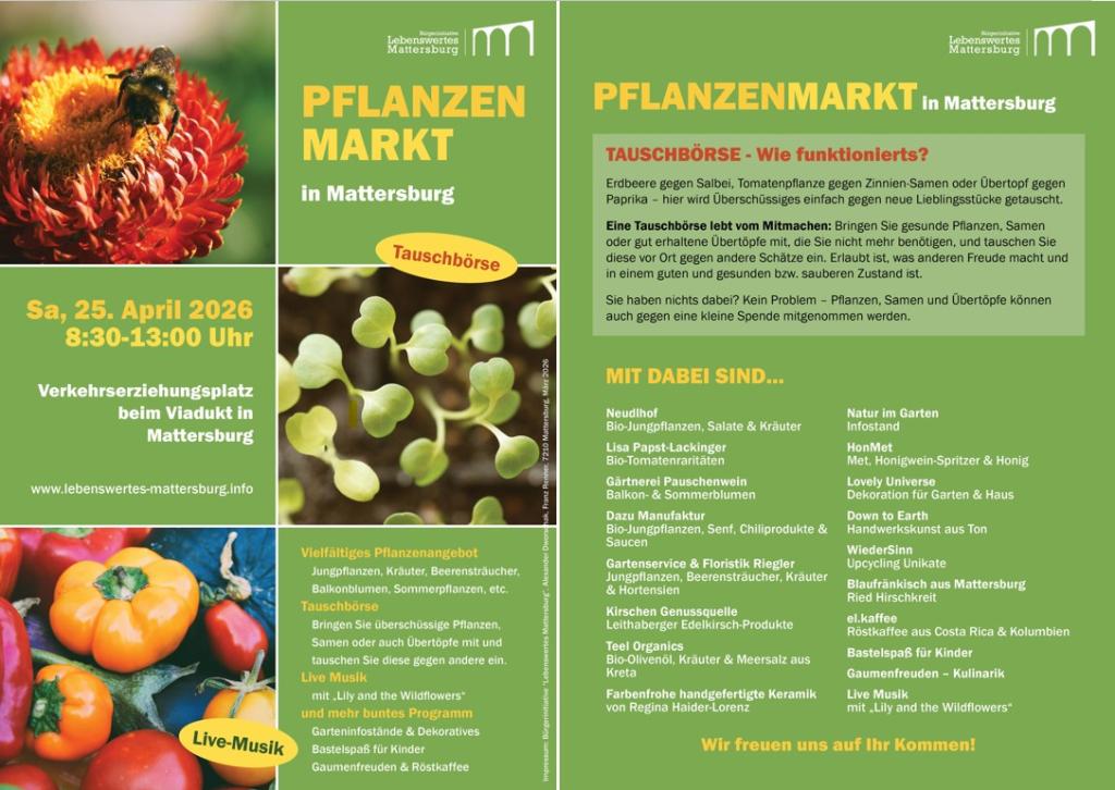 Ein buntes Fest für alle (Garten-)Sinne - die dritte Auflage: Mit neuen AusstellerInnen, mehr Gartendeko und Kunsthandwerk, einer Tauschbörse, einem erweiterten kulinarischen Angebot und mit Live-Musik. Das bereits bekannte und beliebte Angebot an Bio-Pflanzen und Paradeiser-Raritäten wird ergänzt durch neue AustellerInnen, beispielsweise die Dazu Manufaktur aus Walbersdorf mit ihren Chiliprodukten und Jungpflanzen, HonMet aus Marz mit dem ersten Honigwein-Spritzer Österreichs, dazu – ebenfalls neu – Gartendeko, Keramik oder Designprodukte aus recycelten Materialien von Lovely Universe, Down to Earth und WiederSinn. Auf der Tauschbörse können überschüssige Pflanzen oder Übertöpfe gegen neue Lieblingsstücke getauscht werden. Bitte Taschen oder Transportkisten mitbringen. Erweitert wird auch das kulinarische Angebot, hausgemachte Köstlichkeiten wie Grammelpogatscherl oder Mehlspeisen gibt es wie jedes Jahr, diesmal aber auch einen Würstelstand. Dazu im Burgenland gerösteter Cafe von el.Kaffee und wie immer der beste Rotwein Mattersburgs von der Ried Hirschkreit. Das alle begleitet von Live-Musik mit Lily and the Wildflowers.