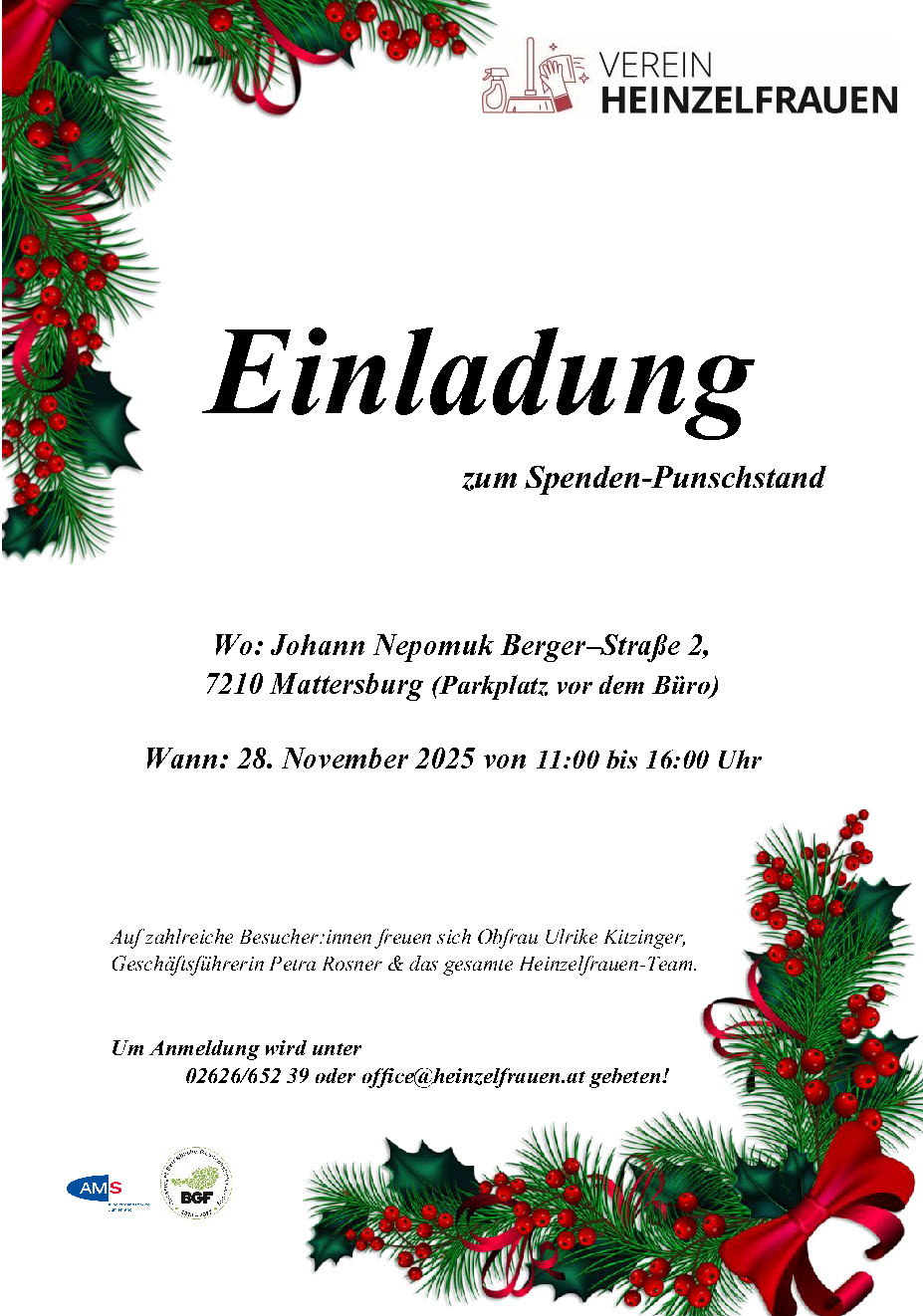 Unser alljährlicher Spendenpunschstand findet auch dieses Jahr statt! Wir laden alle herzlich ein, gemeinsam mit uns gemütliche Stunden zu verbringen und gleichzeitig was Gutes zu tun: mit Glühwein, Punsch (mit und ohne Alkohol) sowie selbstgemachten Keksen und Leckereien. Der Reinerlös kommt ausschließlich den (Heinzel)Frauen zugute.